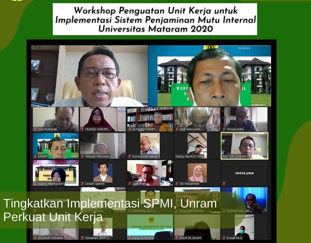 The Quality Assurance and Development Institute of the University of Mataram (LPMPP Unram) held a Workshop on Strengthening Work Units for the Implementation of the 2020 Internal Quality Assurance System (Unram) virtually through Zoom, Tuesday, November 10, 2020 Morning. Head of LPMPP Unram Dr. Ir. Lestari Ujianto, M.Sc. explained, the event aims to find efforts in order to strengthen work units at Unram so that the implementation of SPMI can run well. The achievement of this activity is the implementation of the Internal Quality Assurance System in all work units at the University of Mataram, he explained.